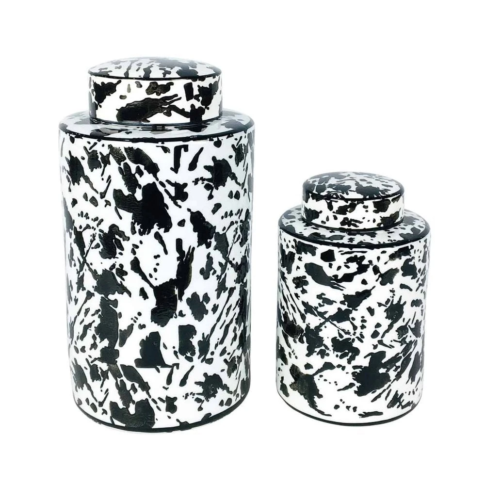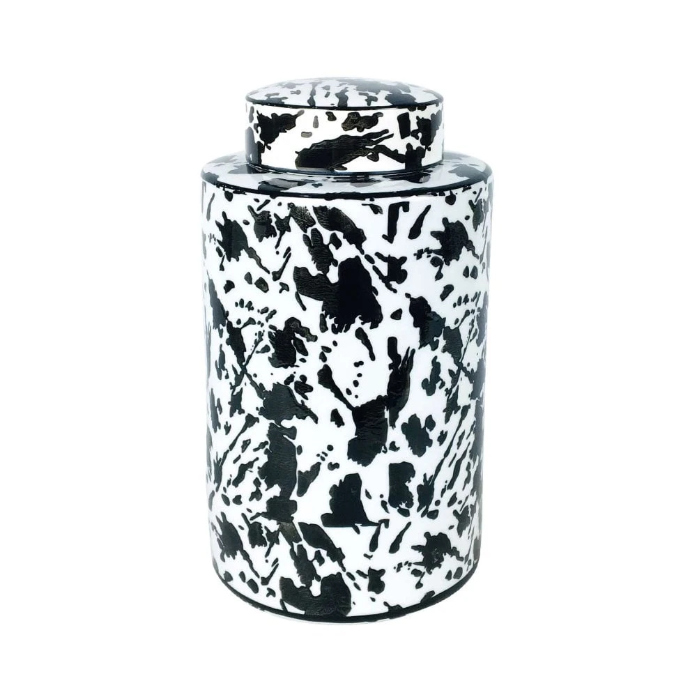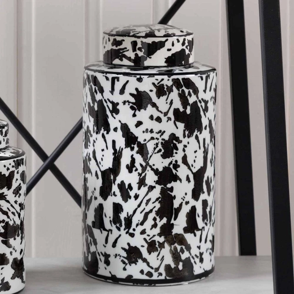 This large ginger jar sports a fabulous, abstract pattern in black and white. It’s a striking accent piece for your living room sideboard or your dressing table. The design works in classic, contemporary and bohemian décor schemes. Topped with a matching lid, this cylindrical ginger pot is available in two size options.