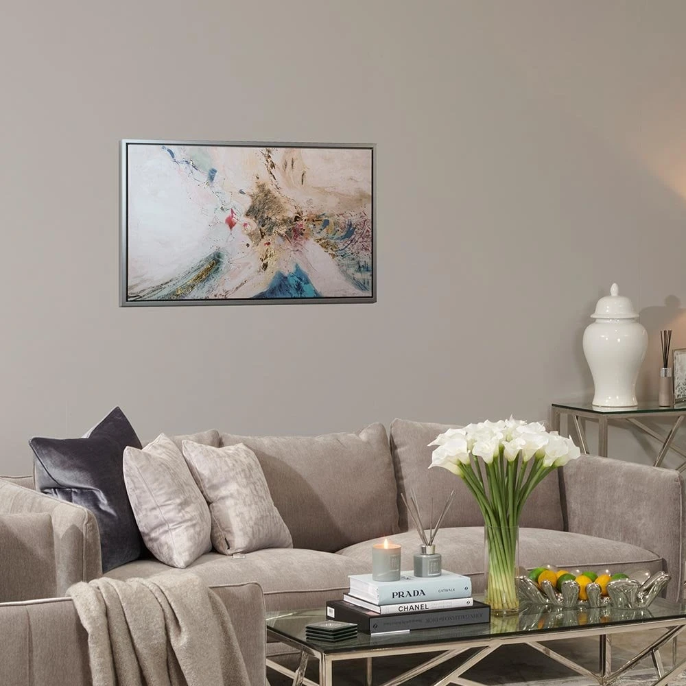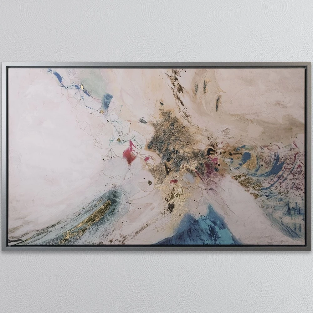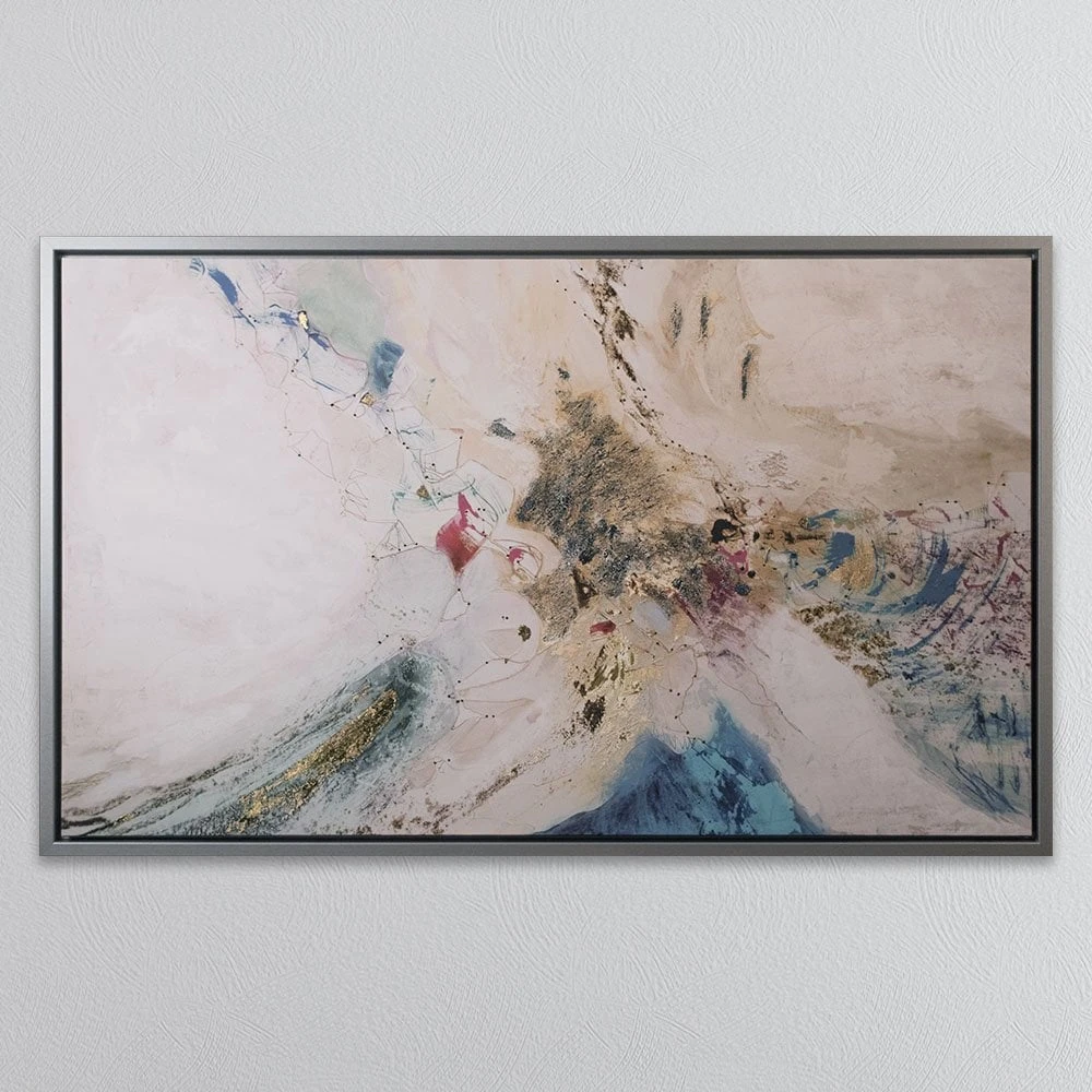 Appearing like an aerial view of the ocean meeting icy shores, this contemporary art piece will spark conversation. It’s a vibrant palette of crisp white and sapphire-blue with pops of pink and yellow. This abstract art will bring wild beauty to your home – it deserves a prominent place in your living room.