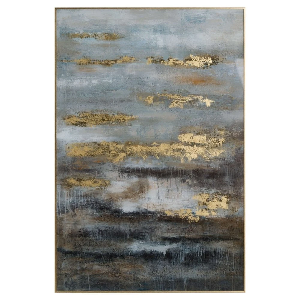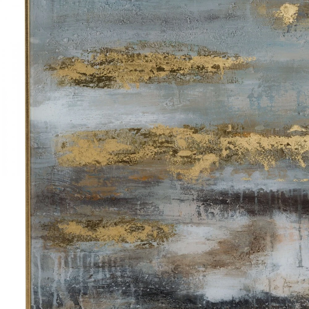 This stunning piece of artwork is sure to make a statement within any interior. Featuring a mixture of neutral and stylish colours including grey, blue and gold, it creates a glamorous addition where ever it is placed. It is complete with a silver frame, be sure to take a look at 19978 and 19981 for the other versions.