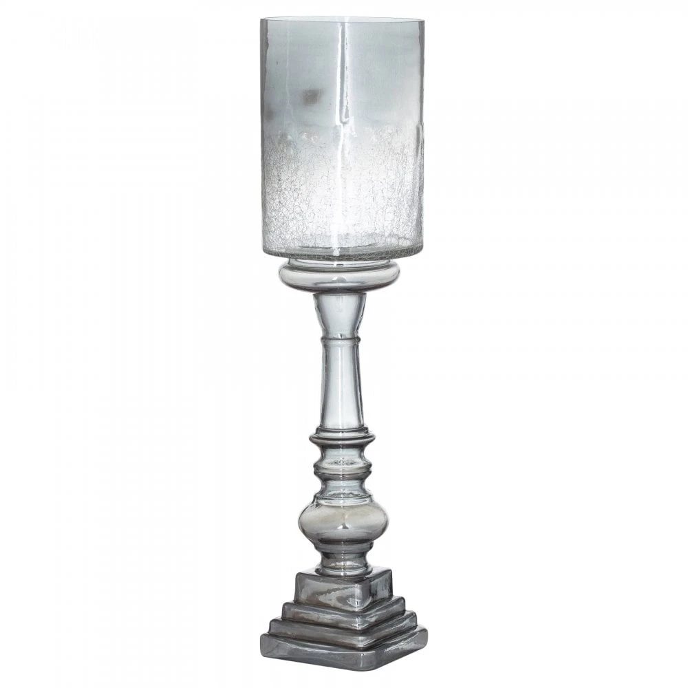 Enjoy the beauty of smoked glass and a cosy atmosphere with this elegant candle holder. It has a handcrafted, textured glass cup to hold a pillar candle, set on a glass column with exquisite, carved details. The soft, grey tone will blend in perfectly with your classic or Nordic décor.