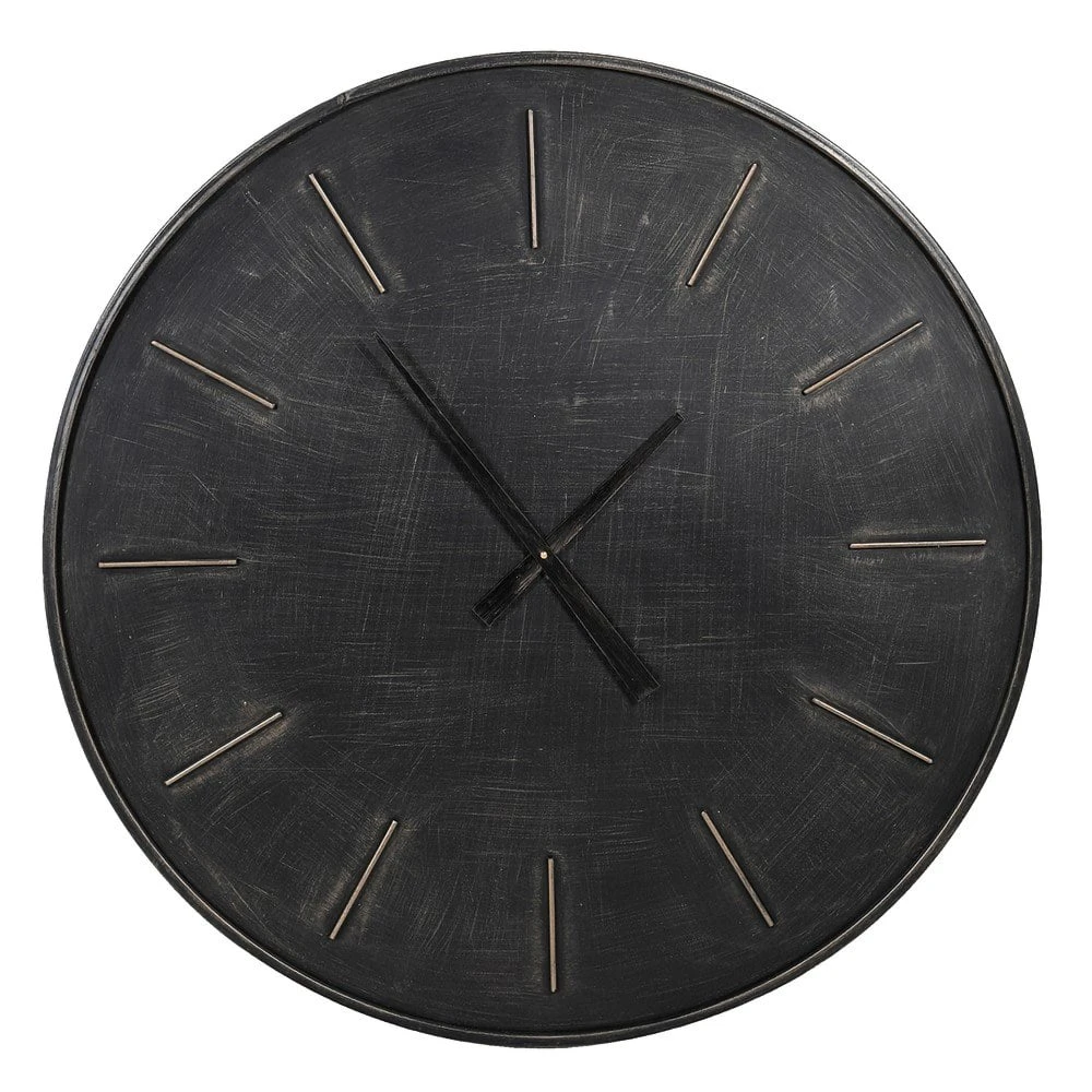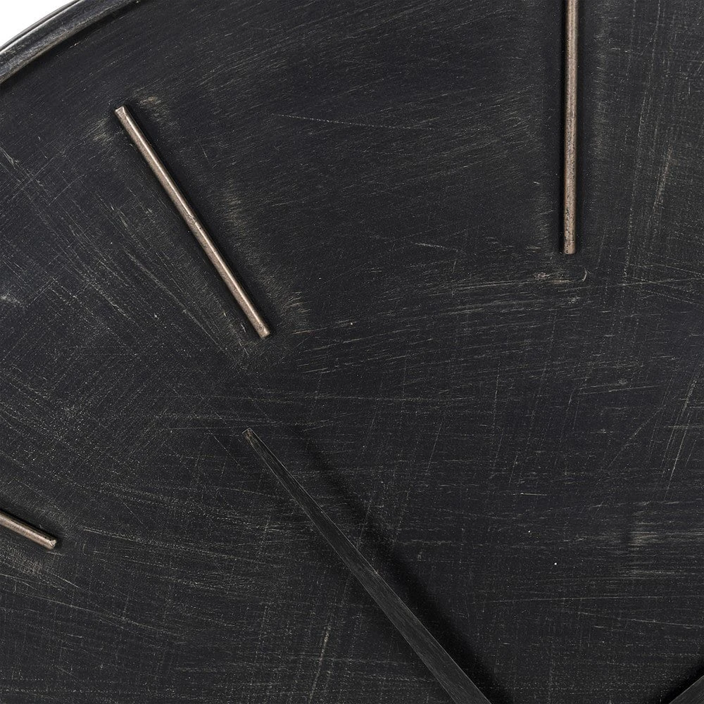 This large metal clock will make an impact on your wall, with its deep black finish and minimalist markers. It features light distressing on the face for a worn-in look that suits industrial spaces. The round clock is edged in brushed silver to match the markers, while simple, black hands complete the stark design.