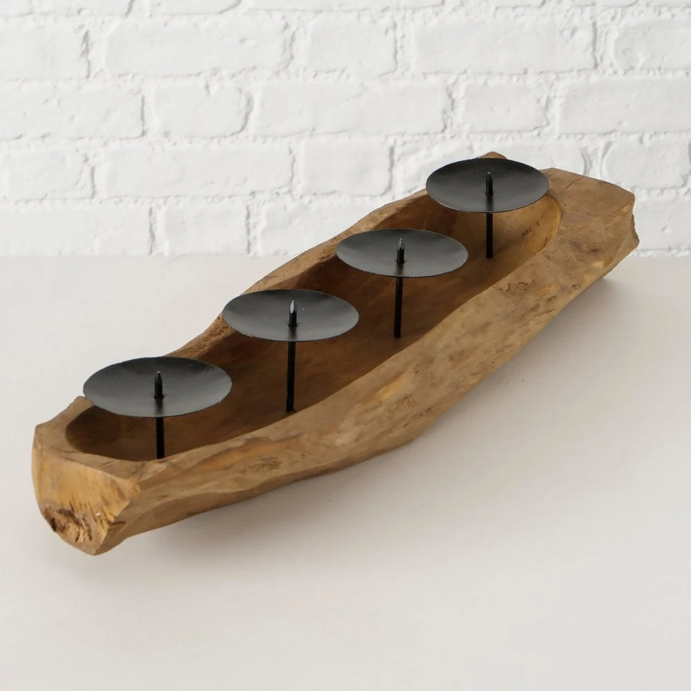 Add natural texture and a soothing glow with this rustic wood candle holder. Crafted from a teak wood log, the base has rough-hewn edges and a richness of colour. On top, you can set four pillar candles on the black metal stands. Make this a table centrepiece in your coastal or Nordic interior.