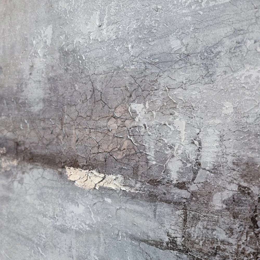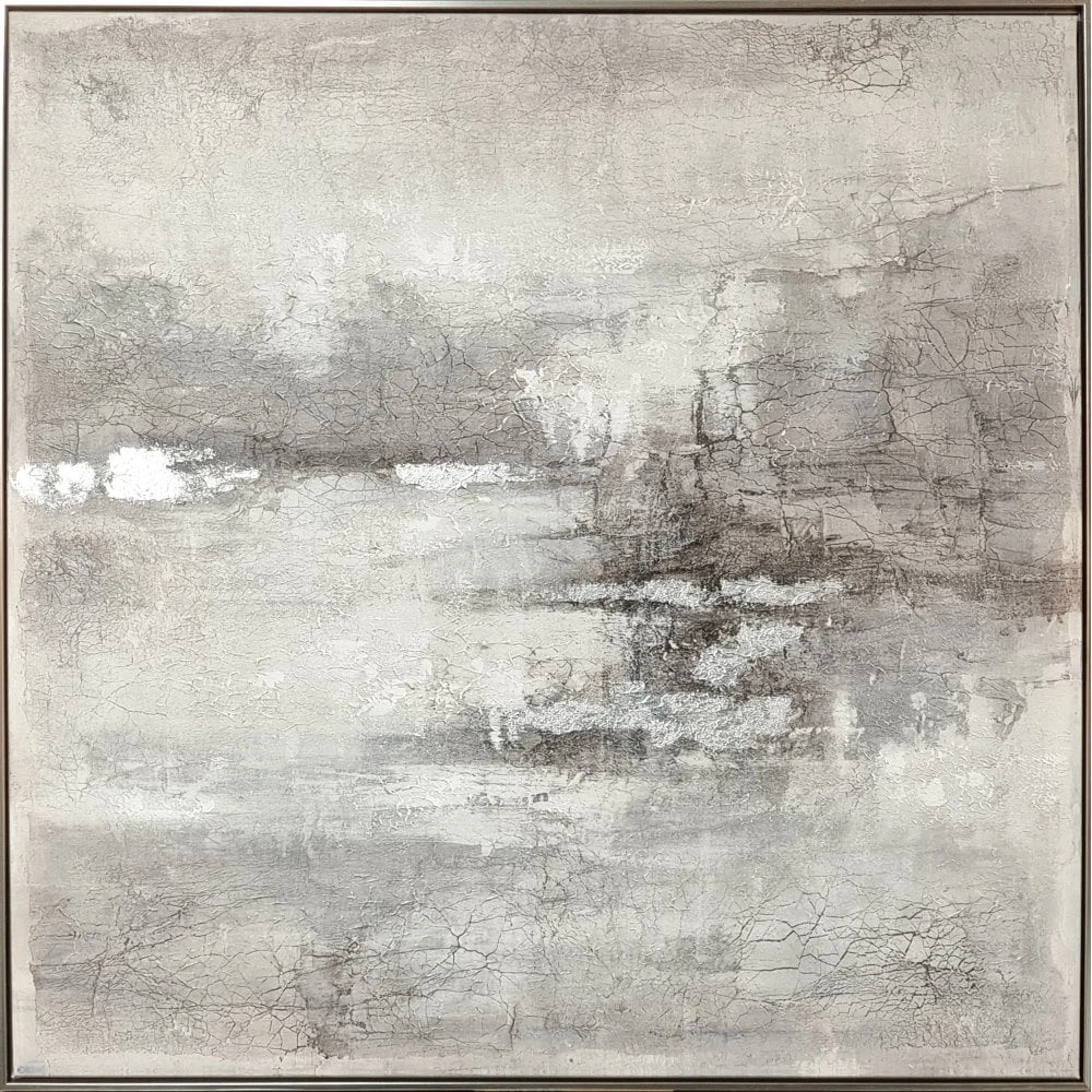 Invite the calming influence of soft grey into your home with this beautiful oil painting. Though abstract, the design calls to mind a serene forest or perhaps a still lake in midwinter. Crackles within the splashes of paint add layers of texture, ensuring this wall art is as captivating as it is elegant.
