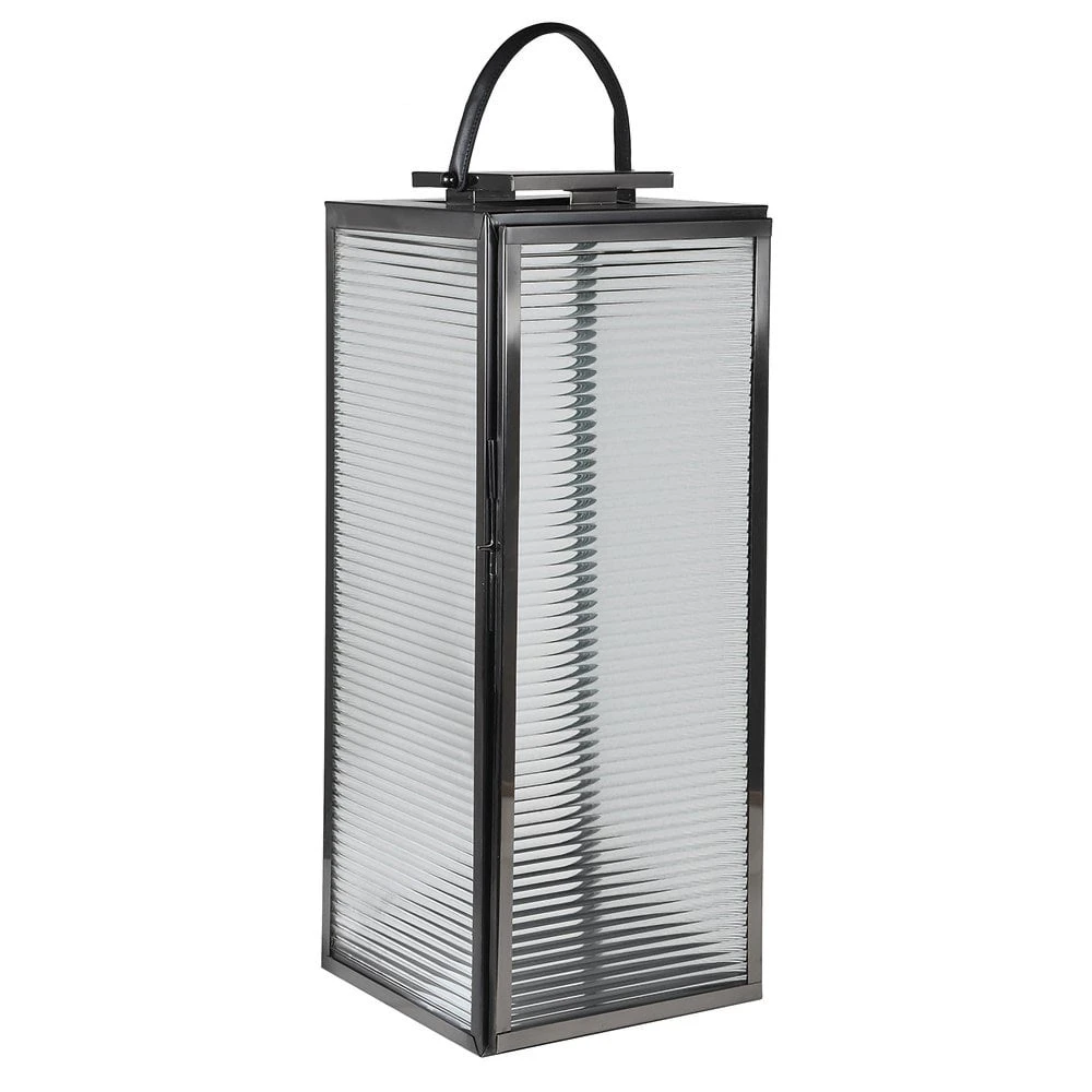 Transform the look and mood of your room with this stylish glass lantern. It boasts a sleek frame of stainless steel, with clean lines accentuated by ribbed glass. Light will radiate around your room in a distinctive way, creating a cosy atmosphere even in a minimalist space. This large lantern looks particularly effective on a fireplace.