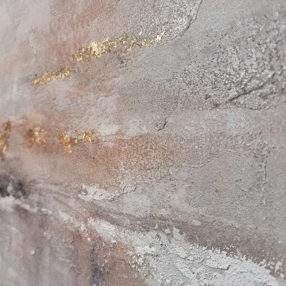 Like the rose-tinged sky of a late summer evening, this abstract oil painting is calming and inspiring. Blush pink and ivory tumble with whispers of grey and touches of deep aubergine. A sprinkling of bright gold adds a luxe look, making this a dreamy work of art for your romantic décor scheme.