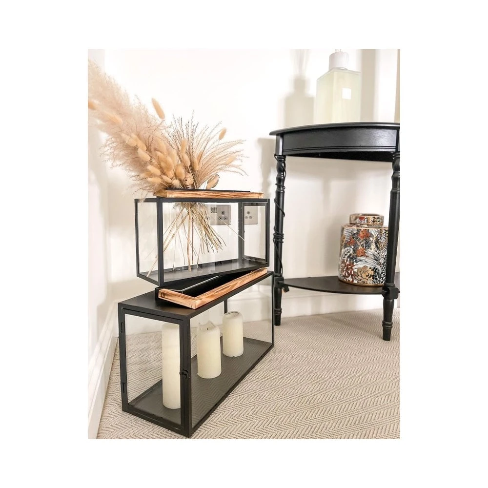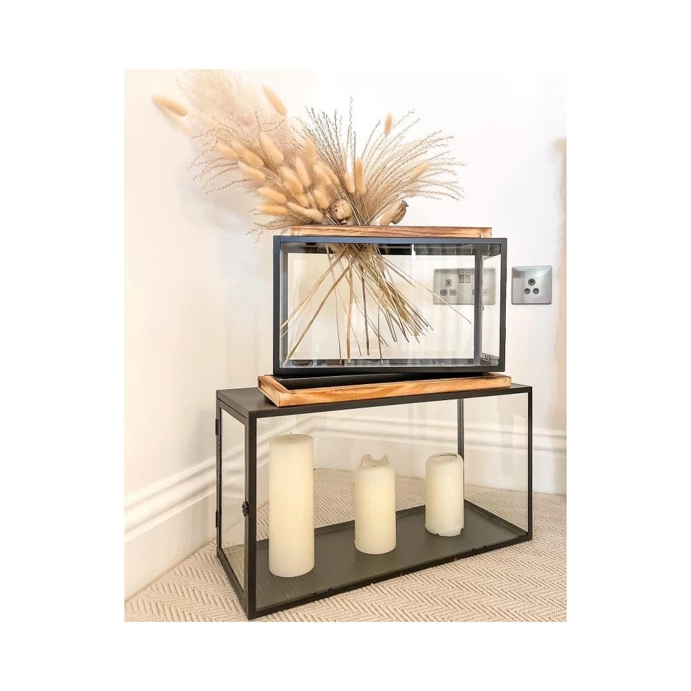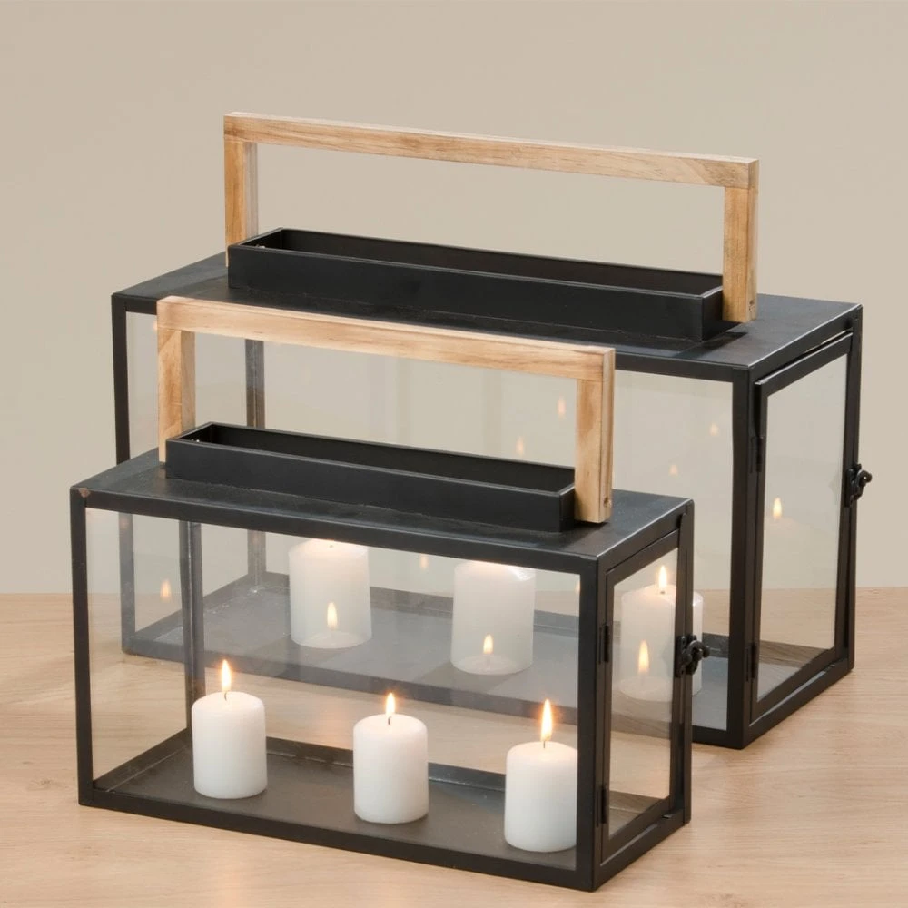 A modern take on the ever-popular hurricane lamp. These glass lanterns come as a pair, each one showcasing a boxy design of neat lines. Black metal meets an angular wooden handle for a pleasing contrast of materials. Add pillar candles and display by the fireplace to create a cosy vibe in your living room.