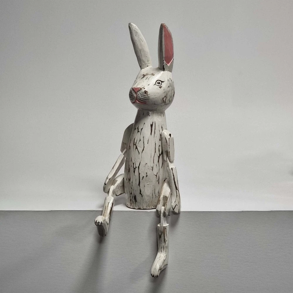 Display this shelf rabbit alone or with the smaller versions for characterful décor! Handcrafted in Bali, this is a charming addition to your eclectic interior or kid’s room. The rabbit will sit upright on your bookcase, watching over you as his jointed limbs dangle. He has a distressed finish that’s full of vintage style.