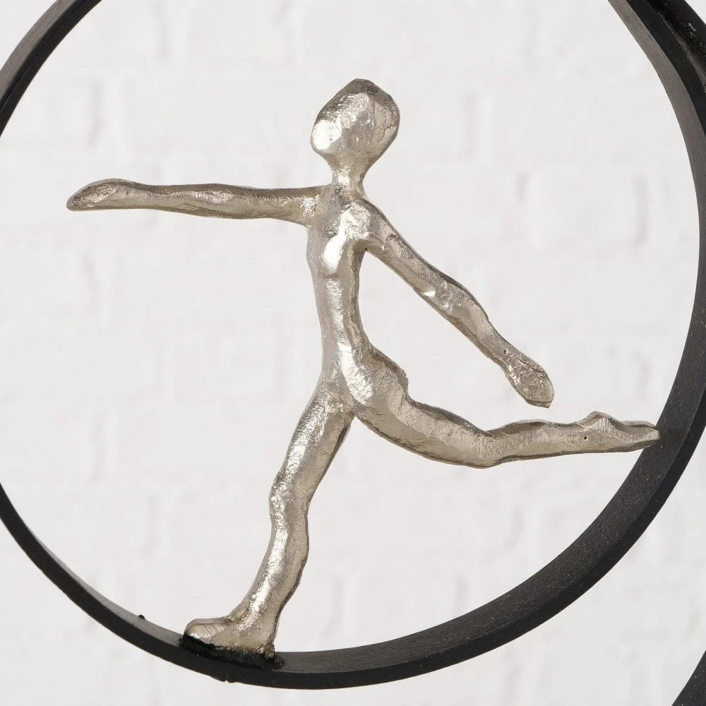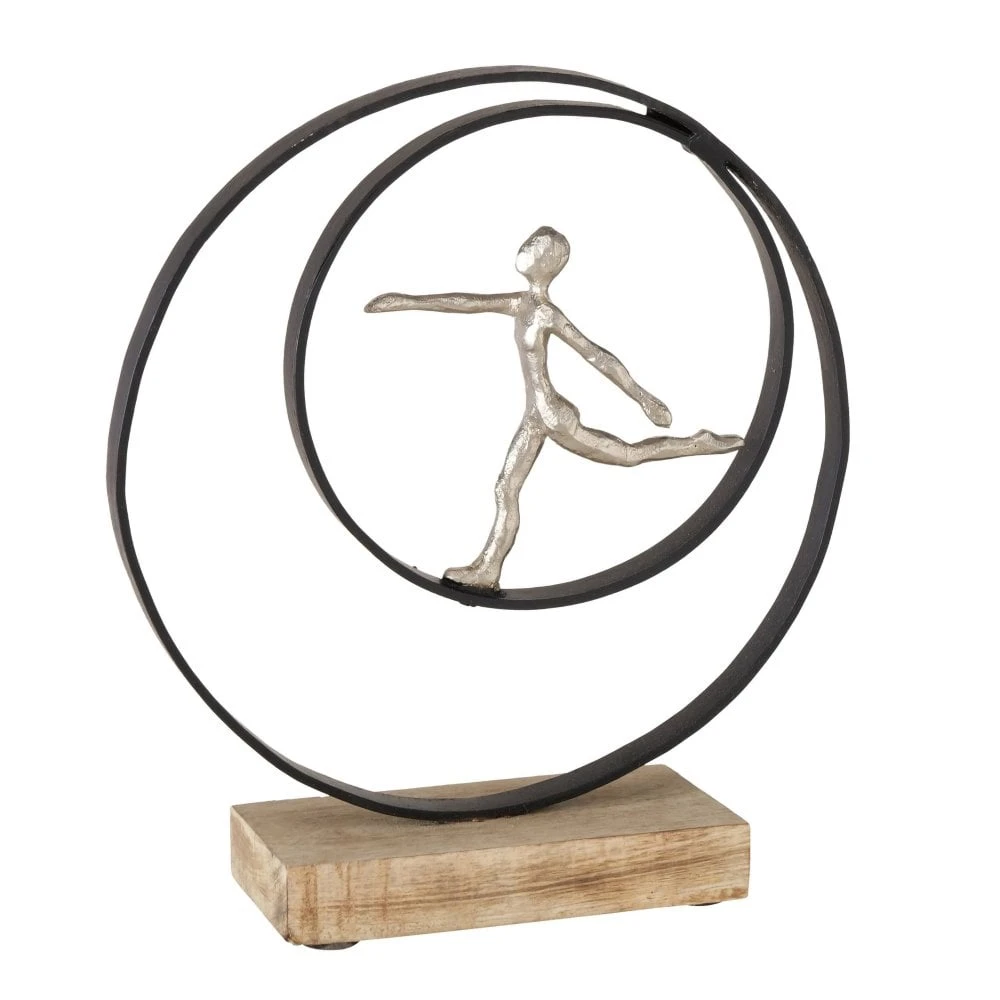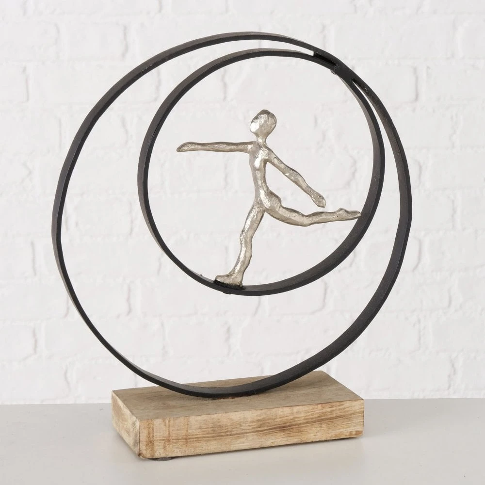 Add movement and interest to your décor with this unique dancer ornament. It features minimalist curves and abstract form to eye-catching effect. A stylised, silver-coloured figure balances in two black metal circles. A chunky mango wood stand provides an attractive contrast and makes displaying easy. Perfect for a modern or Nordic interior.